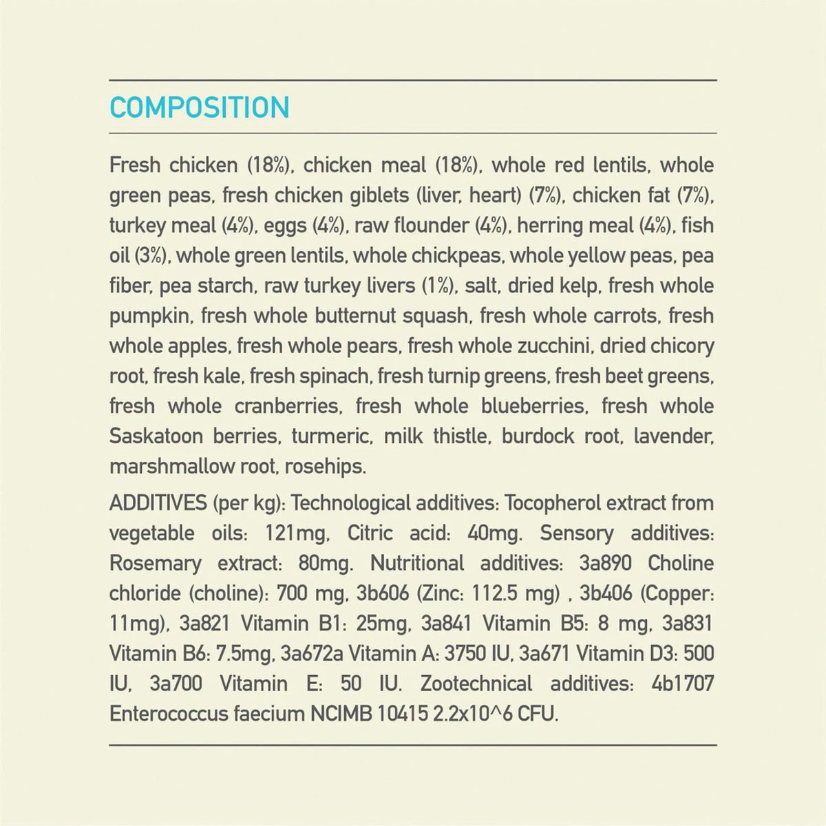 Voedingsadvies:Gewicht hond (kg)Niet-actief (gr/dag)Actief (gr/dag)24060560120101201802020030030270420403305105040060060450690Samenstelling:Verse gefileerde kip (16%)*, Gedroogd kippenvlees (13%), Gedroogd kalkoenvlees (13%), Rode linzen, Hele groene erwten, Vers kippen orgaanvlees (lever, hart en nier)(7%)*, Kippenvet (7%), Verse hele eieren (3%)*, Verse gefileerde platvis (3%)*, Gedroogde haring (3%), Haring olie (3%), Zongedroogde alfalfa, Groene linzen, Veldbonen, Hele gele erwten, Erwtenvezels, Vers kippenkraakbeen (2%)*, Gedroogd bruin zeewier, Verse hele pompoen*, Versehele muskaat pompoen*, Verse hele pastinaak*, Verseboerenkool*, Verse spinazie*, Verse mosterdplant blad*,Verse raapstelen*, Verse hele wortelen*, Verse Red Delicious appels*, Verse Barlett peren*, Gevriesdroogde kippenlever, Gevriesdroogde kalkoenlever, Verse hele veenbessen*, Verse hele blauwe bessen*, Cichoreiwortel, Kurkuma, Mariadistel, Kliswortel, Lavendel, Heemstwortel, Rozenbottels. *= ingrediënten VERS aan de bereiding toegevoegd!