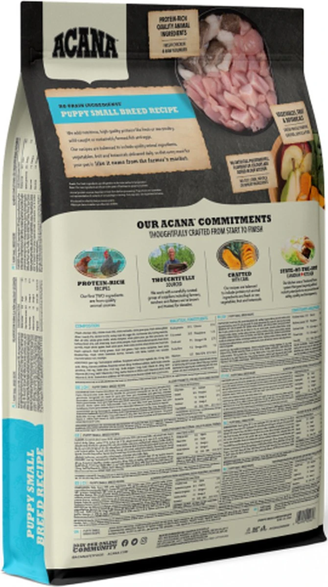 Acana Heritage Puppy Small Breed 6kgBereid in onze gecertificeerde keukens in Canada is ACANA PUPPY SMALL BREED rijk aan lokaal gefokte scharrel kip, scharrel eieren, in het wild gevangen platvis, zongerijpt fruit en groenten ? geleverd rijk aan voedingssto en door boeren en telers uit onze regio zodat uw puppy gezond sterk en gelukkig kan zijn. Bekijk onze ingrediënten en wij denken dat u tevreden bent.