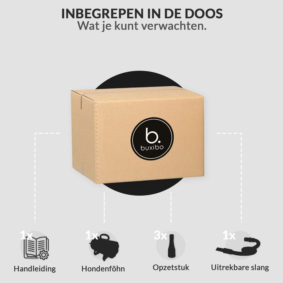 Een hond is een gevoelig huisdier, daarom is de waterblazer voorzien van een draaiknop waarmee je zeer gemakkelijk de blaaskracht kunt bepalen. De blaaskracht kan bepaald worden tussen de 500 en 3400 Watt. Als je een grote hond hebt, dan zou je de kracht van de föhn hoger kunnen zetten dan wanneer je een kleine hond hebt. Om je hond aan de föhn te laten wennen, raden we je aan om de hondenföhn in het begin op de laagste stand te zetten en dit vervolgens geleidelijk op te voeren. Vind je hond het nog steeds niet prettig op de laagste stand? Probeer het dan zonder mondstuk, het geluid en luchtstroom zal een stuk minder sterk aanvoelen.
