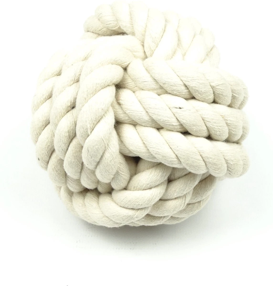 Deze bal is gemaakt van touw/katoen. De bal is erg sterk omdat het touw op een speciale manier is gewikkeld. De bal is perfect om met uw hond in huis te kunnen spelen. Door het touw is de bal goed voor het gebit van de hond, het touw masseert de tanden en het tandvlees. Uw hond kan veel plezier hebben met deze bal.