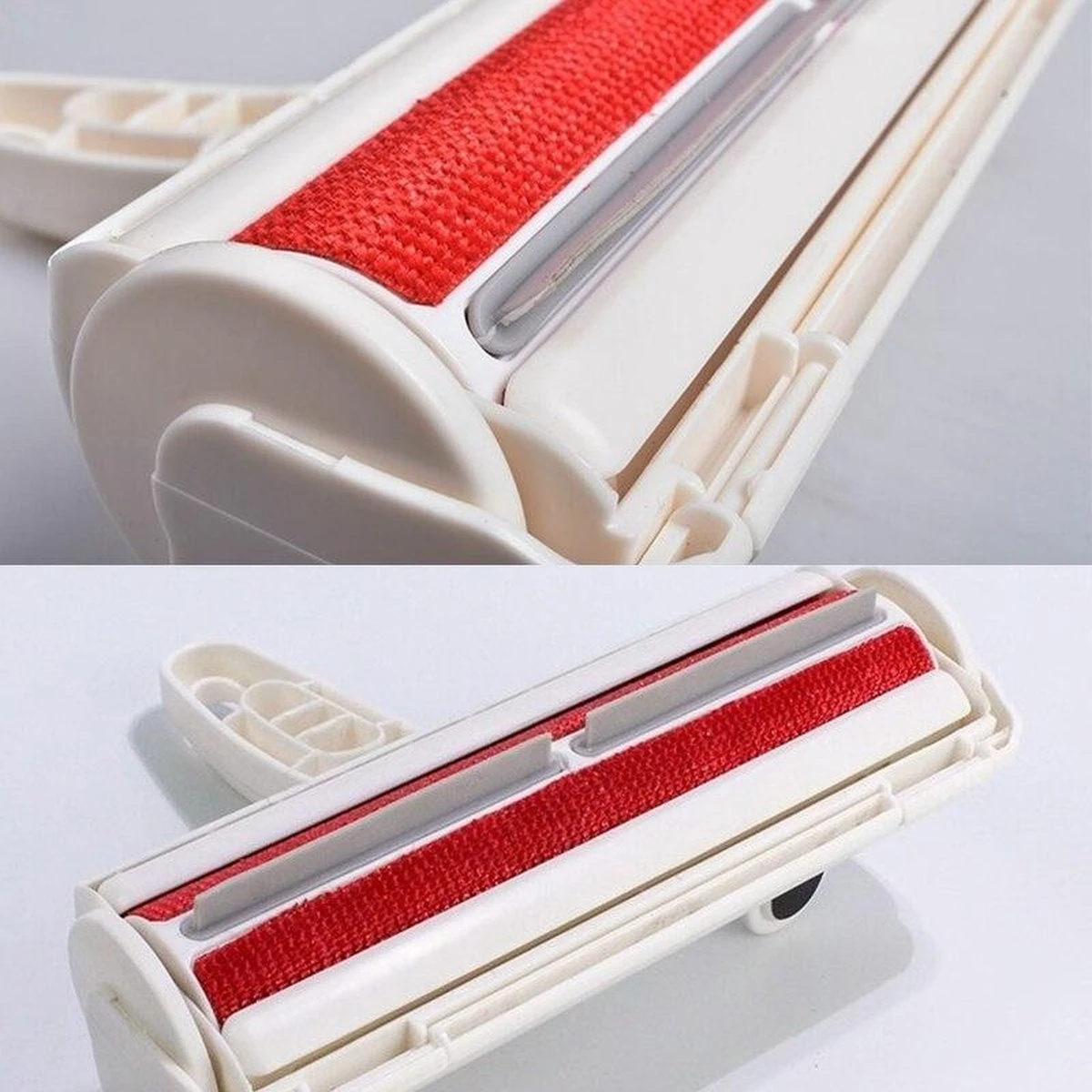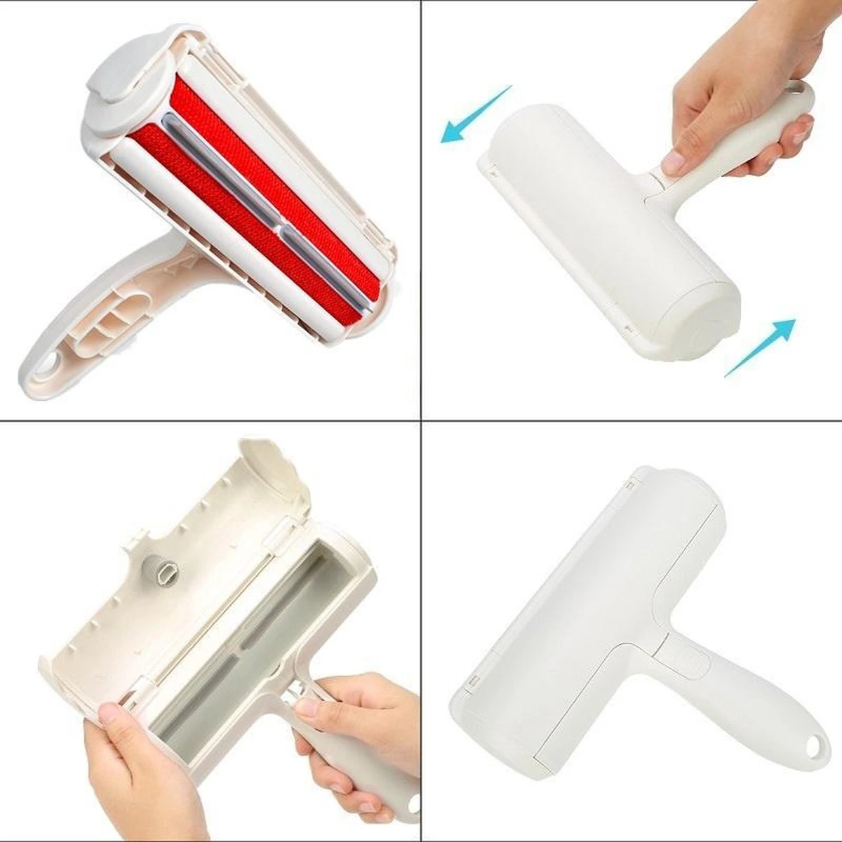 Zoals je kunt zien op de foto’s zie je dat er een opvangbakje aanwezig is in de roller. Wanneer je snel op en neer beweegt op een plek waar haren liggen komen de haren terecht in het opvangbakje. Pak nu gemakkelijk de katharen en hondenharen direct van alle banken, bedden, tapijten, dekens, dekbedden en nog veel meer. Wanneer het opvangbakje vol is kun je het bakje openen en vervolgens de haren deponeren in de afvalbak. Zo Simpel is het. In de afbeeldingen vind je een handig voorbeeld hoe je de borstel het beste kunt gebruiken.